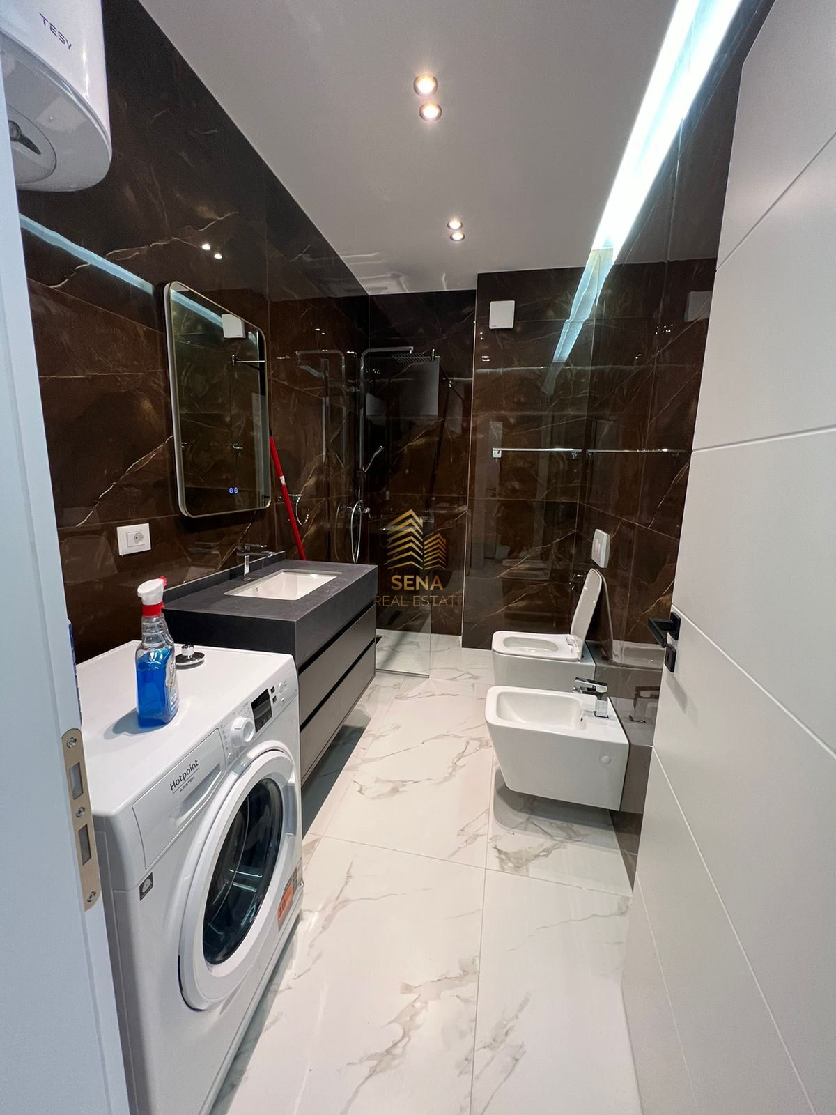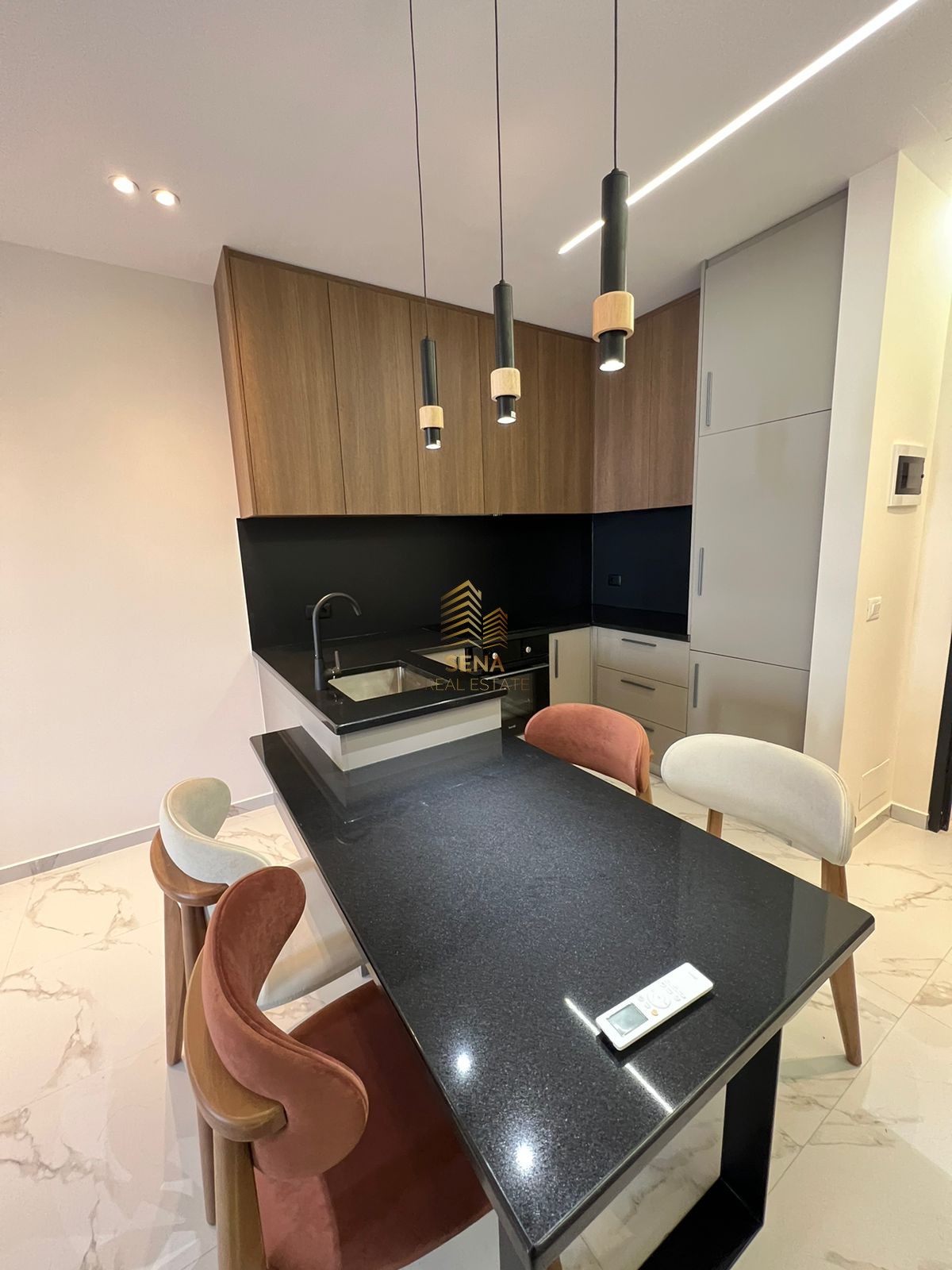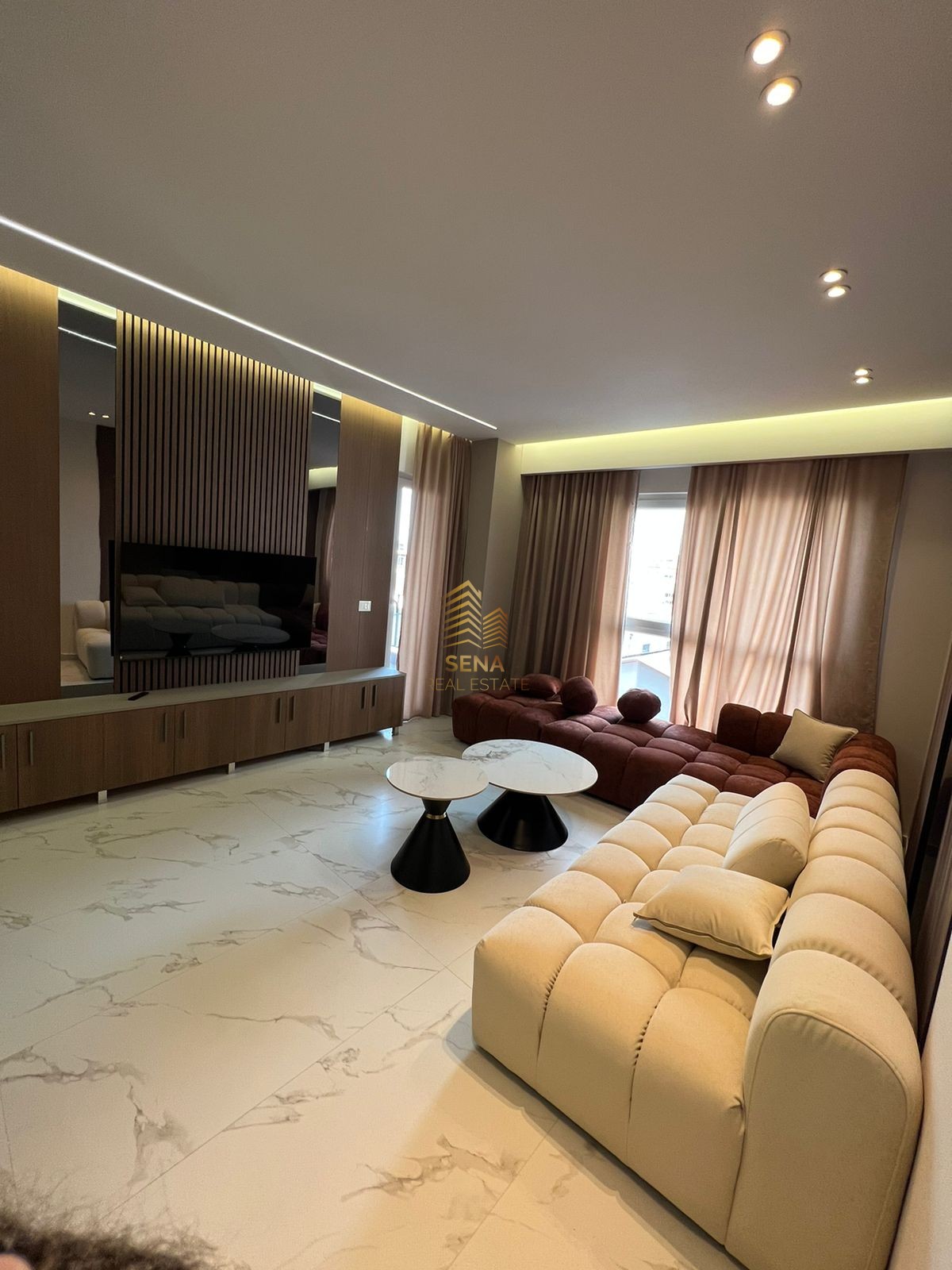 Apartamenti është i investuar në detaj me stil luksoz dhe dizajn unik. Sallon ndenje i konceptuar me divan këndor premium, tavolina elegante me efekt mermeri dhe ndriçim LED të fshehur. Muret jane me panele dekorative dhe kombinime harmonike të ngjyrave.