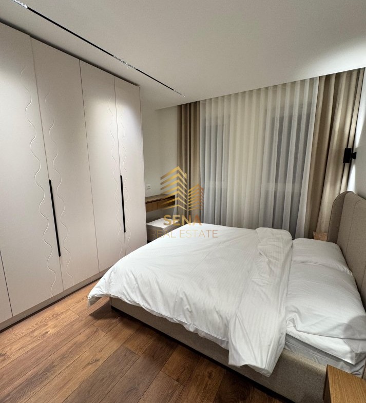 Arredimi i apartamentit është bashkëkohor, harmonik dhe shumë funksional, me mobilje druri cilësore dhe pajisje të integruara, ndriçim LED të fshehur dhe detaje dekorative bashkëkohore.